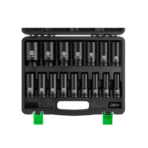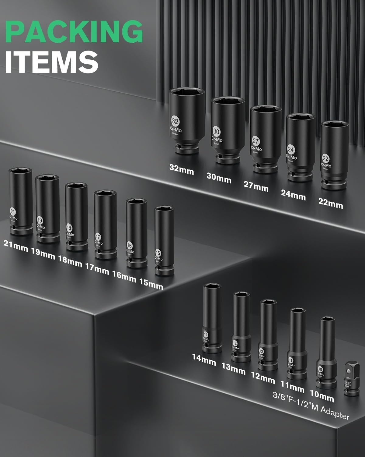 - Standard sizes: 1/2 inch impact wrench socket includes the following sizes: 10 mm, 11 mm, 12 mm, 13 mm, 14 mm, 15 mm, 16 mm, 17 mm, 18 mm, 19 mm, 21 mm, 22 mm, 24 mm, 27 mm, 30 mm, 32 mm. Ideal for a variety of tasks. For professional and domestic use. It is equipped with a 3/8″ to 1/2″ adapter to allow for hassle-free use in multiple scenarios.