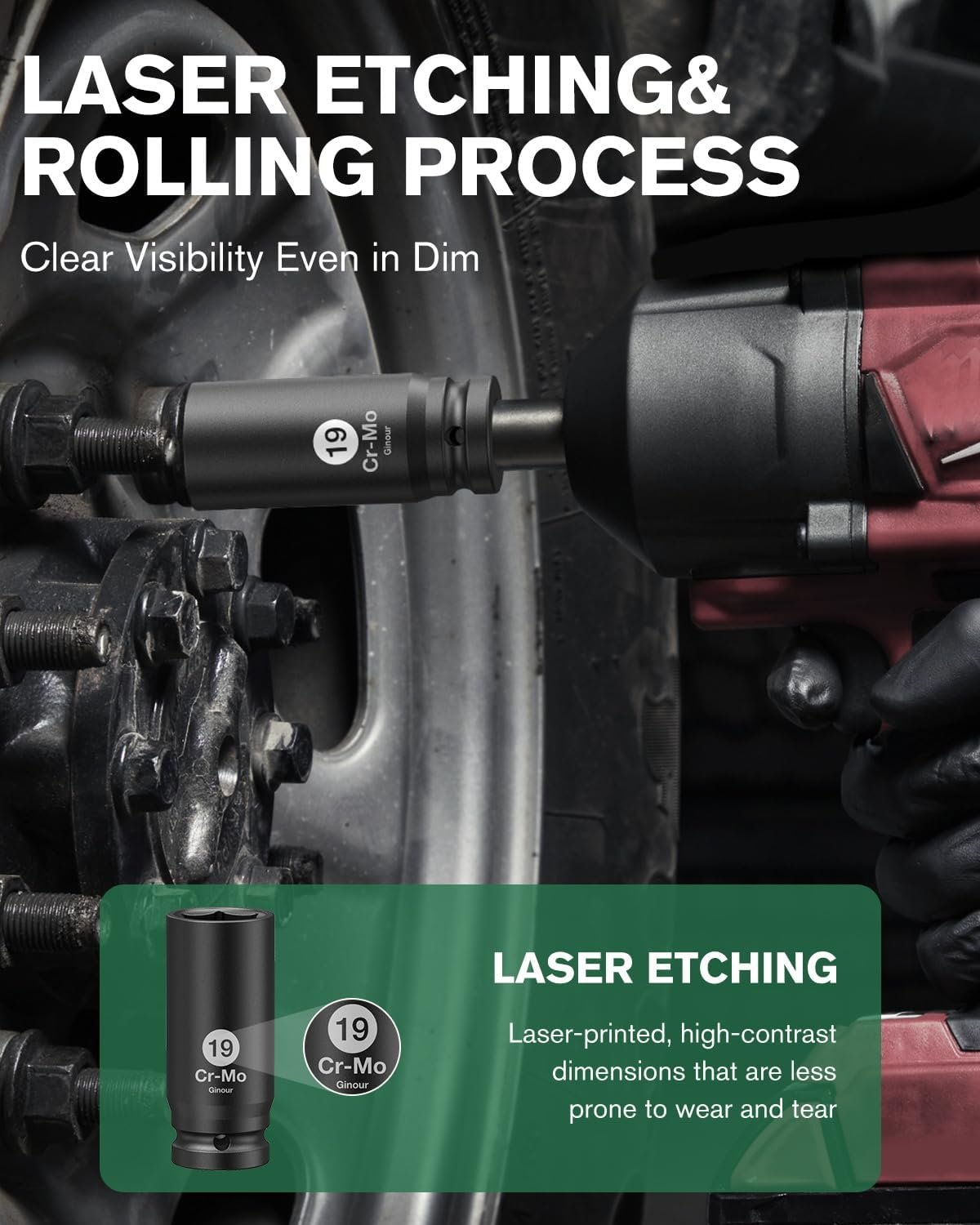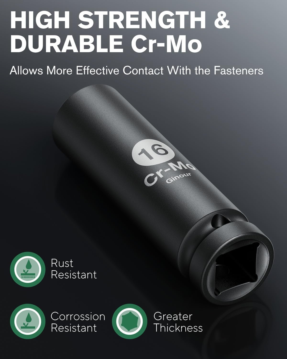 - HEAVY DUTY QUALITY The Ginour impact wrench nut set is made of durable chrome molybdenum steel and finished with a protective phosphor coating that provides effective rust protection. This durable material ensures reliable and long-term use.