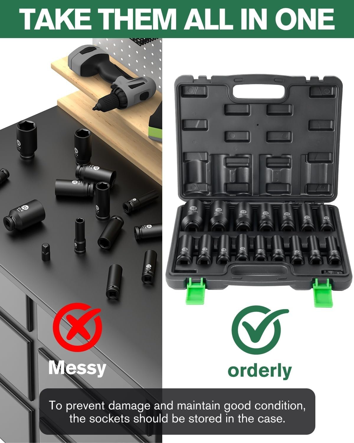- What you get: 16 x Ginour impact wrench nuts set 1/2 inch; 1 x 3/8 inch to 1/2 inch socket adapter, 1 x storage box; 24 months warranty and friendly customer service.